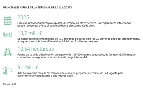 Los operadores interesados en la gestión y explotación de la terminal de La Llagosta (Barcelona) ya pueden presentar sus ofertas hasta el próximo 12 de abril. Como recogen los pliegos de Adif para este contrato, el futuro adjudicatario debe destinar una inversión mínima inicial de 12 millones de euros en la terminal. Adif ha lanzado el concurso con un plazo de explotación de 20 años, prorrogable otros 20 más en función de una serie de condiciones e inversiones, y con una renta mínima de 13,7 millones de euros sin impuestos para las dos primeras décadas. Tal y como ya había avanzado la compañía pública, se estima que el nuevo gestor comience el 1 de mayo de 2025 a operar esta instalación estratégica para el desarrollo de la red intermodal de Adif y del Corredor Mediterráneo.