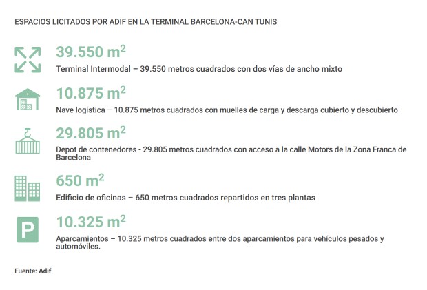 El paquete expuesto a licitación consta de un total de seis espacios dedicados a las operaciones logísticas, con un “espacio logístico para el tratamiento intermodal” de 39.550 metros cuadrados como activo principal. Adicionalmente, también se recoge un depot para el almacenamiento de contenedores de 29.805 metros cuadrados, dos aparcamientos para vehículos pesados y automóviles de 10.325 metros cuadrados, viales de acceso y una oficina para el control de estos de 7.325 metros cuadrados, un edificio de oficinas de 650 metros cuadrados y tres plantas, y una nave logística con dos muelles envuelta por dos vías de ancho mixto que en total mide 10.875 metros cuadrados.