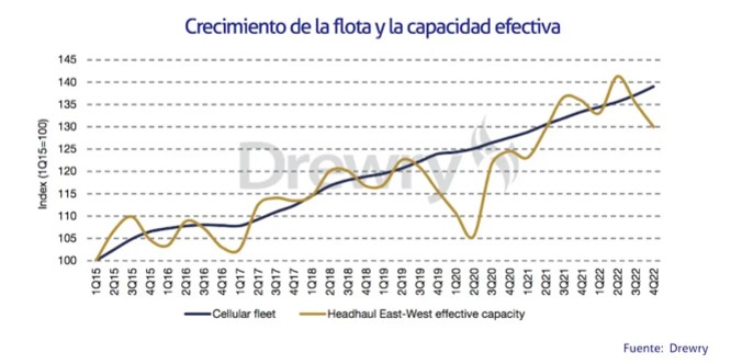 Drewry concluye que las navieras harán un uso menos productivo de los activos para librar la guerra contra el enorme problema del exceso de capacidad, por lo que los cargadores deben estar preparados para unos tiempos de tránsito más largos a medida que aumenta la tendencia a ofrecer servicios más lentos.