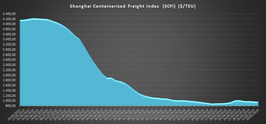 Con un valor de 972,45 USD/TEU, los fletes desde Shanghái (SCFI) reflejan hoy un descenso del -1,12% respecto a la semana anterior y una bajada del -76,6% en comparación con el mismo periodo de 2022. El índice se encuentra un 81% por debajo del pico de 5.109 USD, alcanzado en enero de 2022, aunque sigue siendo un 20% más alto que el promedio de 2019 (antes de la pandemia), situado en 811 USD.
