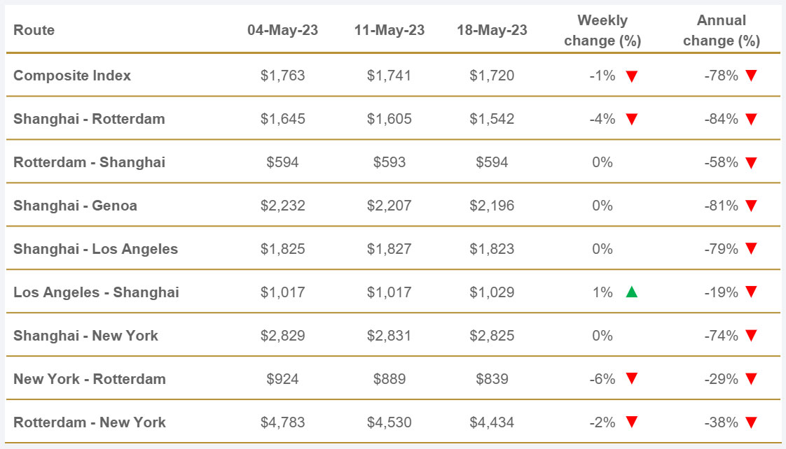 Por su parte, el World Container Index (WCI), que evalúa el coste de los fletes en la principales rutas hacia y desde Estados Unidos, se sitúa en 1.719,95 USD por contenedor de 40 pies, lo que supone una bajada del -1,2% en relación a la semana anterior y un descenso del -77,5 % con respecto al mismo periodo del año pasado. El índice se encuentra un 83% por debajo del pico de 10.377 USD, alcanzado en septiembre de 2021, aunque sigue siendo un 21% más alto que el promedio de 2019 (antes de la pandemia) situado en 1.420 USD.