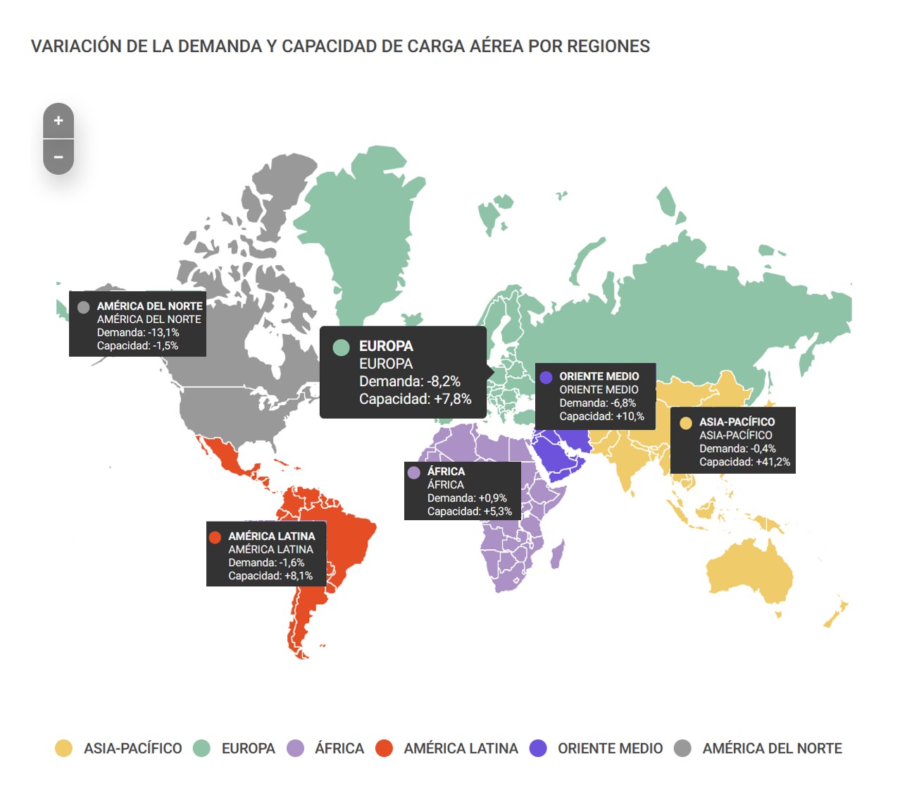 Por regiones, esa mejora asiática queda reflejada en el porcentaje de variación interanual de esta demarcación internacional, que da cuenta del 32,4% de la demanda aérea mundial. Aunque se mantiene en decrecimiento respecto a abril de 2022, el porcentaje del 0,4% registrado en abril reduce significativamente la distancia comparado con el mes de marzo (-7,3%). Además, también aumenta su capacidad (41,2%) por la recuperación del belly cargo, en paralelo “al crecimiento de los vuelos de pasajeros”. Solo una sola región, África, logra resultados positivos de demanda en la comparativa interanual, precisamente por el crecimiento de sus movimientos con Asia, que “reflejan un aumento interanual del 20%”, según IATA.