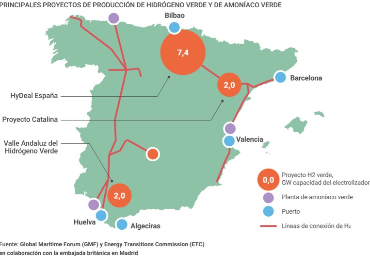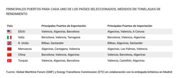 El desarrollo español del hidrógeno y los combustibles de cero emisiones supondrá un espaldarazo para la consolidación de corredores verdes en varias rutas internacionales de transporte de contenedores y carga rodada, en especial, desde los puertos de Algeciras, Valencia, Barcelona y Bilbao, según un informe realizado por las organizaciones Global Maritime Forum (GMF) y Energy Transitions Commission (ETC) en colaboración con la embajada británica en Madrid. Sobre la base del comercio, la demanda de energía, los segmentos comerciales dominantes y el entorno político, el análisis establece varias oportunidades de asociación bilateral para España dentro de Europa y fuera del continente. En concreto, identifica a Reino Unido, Italia y Estados Unidos como los socios más propicios, seguidos de Turquía, Marruecos y China.