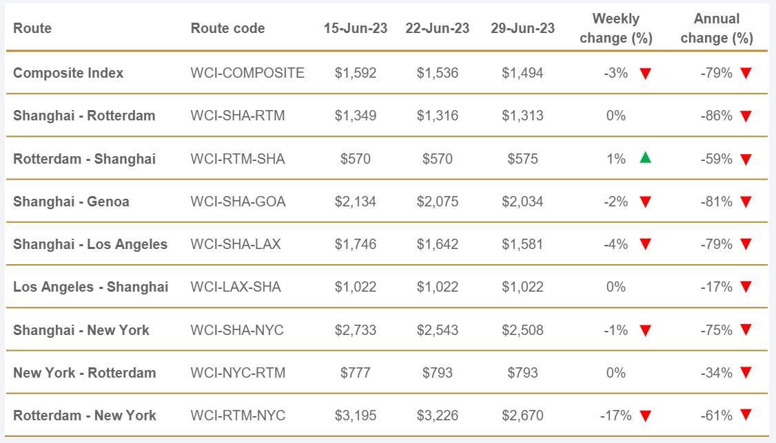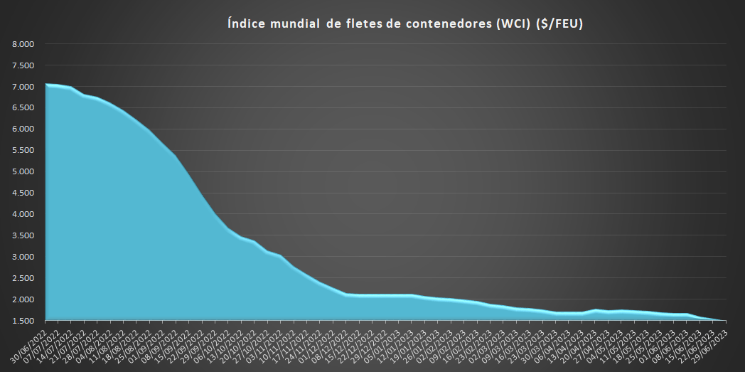 Por su parte, el World Container Index (WCI), que evalúa el coste de los fletes en la principales rutas interoceánicas, se sitúa en 1.494,46 USD por contenedor de 40 pies, lo que supone una bajada del -2,7% en relación a la semana anterior y un descenso del -78,9 % con respecto al mismo periodo del año pasado. El índice se encuentra un 86% por debajo del pico de 10.377 USD, alcanzado en septiembre de 2021, aunque sigue siendo un 5% más alto que el promedio de 2019 (antes de la pandemia) situado en 1.420 USD.