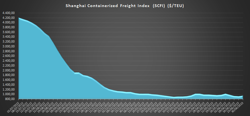 Con un valor de 953,6 USD/TEU, los fletes desde Shanghái (SCFI) reflejan hoy un ascenso del 3,2% respecto a la semana anterior y una bajada del -77,3% en comparación con el mismo periodo de 2022. El índice se encuentra un 81% por debajo del pico de 5.109 USD, alcanzado en enero de 2022, aunque sigue siendo un 17% más alto que el promedio de 2019 (antes de la pandemia), situado en 811 USD.