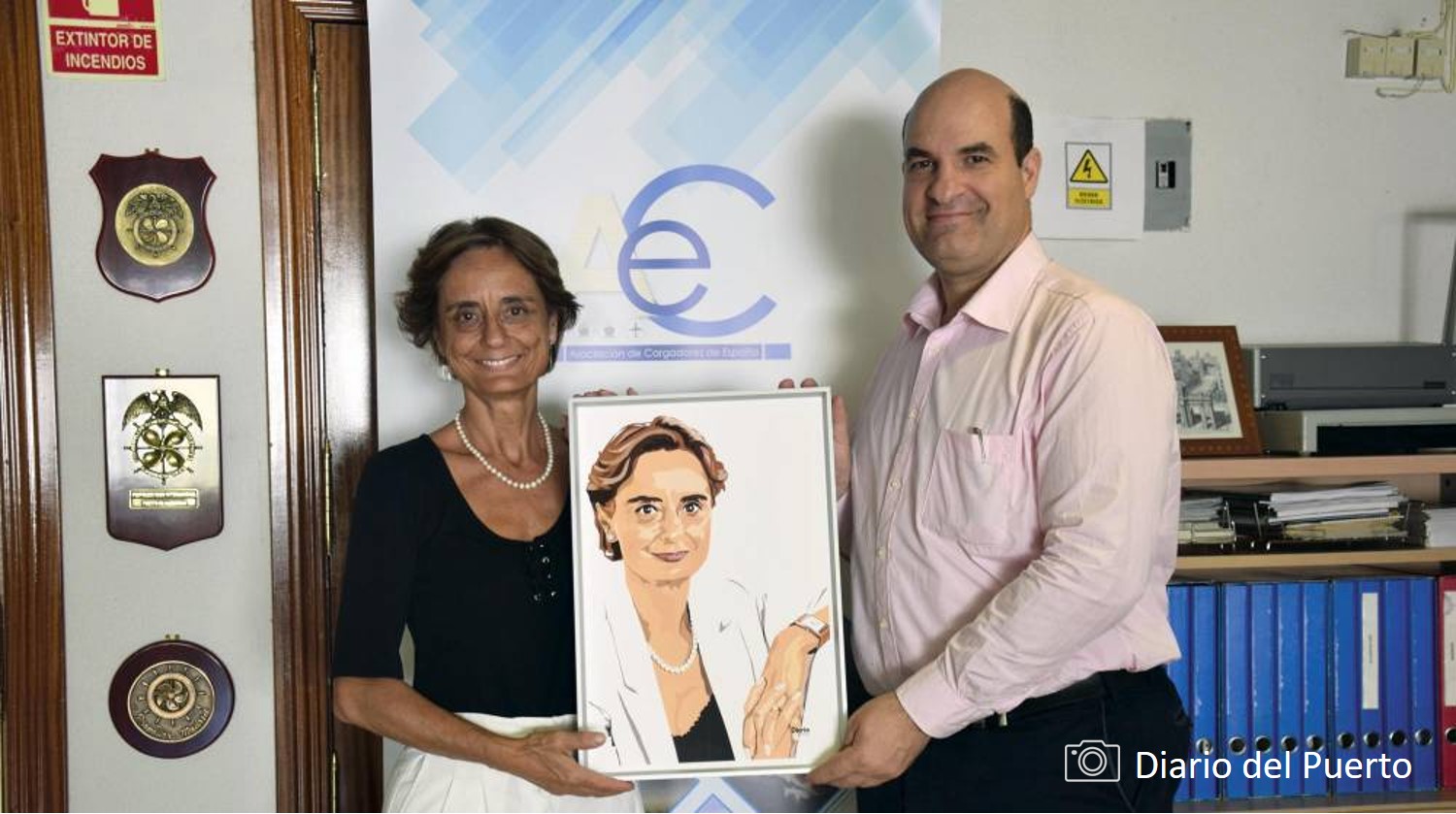 La secretaria general de la Asociación de Cargadores de España (ACE), Nuria Lacaci, mantuvo el viernes una reunión con el director de Diario del Puerto, Miguel Jiménez, en la que este aprovechó para hacerle entrega del cuadro con el retrato realizado por el dibujante Enrique Hormigos y que ilustró la entrevista de la sección “La Contra” publicada en el número del pasado mes de marzo de Diario del Puerto Plus. Durante el encuentro, ambos tuvieron la oportunidad de abordar los principales retos del sector logístico en la actual coyuntura, así como analizar la agenda de las próximas semanas, marcada por las Elecciones Generales, que se celebran este domingo, 23 de julio, y por los distintos impactos en las estructuras de la Administración y en las reformas legales que han quedado pendientes.