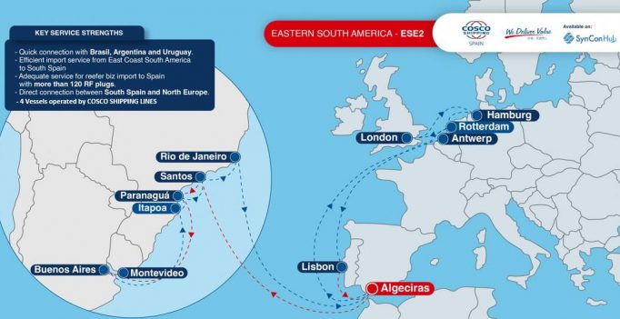 COSCO SHIPPING Lines iniciará en septiembre ESE2, un nuevo servicio semanal que conectará el norte de Europa y el Mediterráneo con la costa este de América del Sur. El portacontenedores XIN NAN TONG, perteneciente a la compañía, lo inaugurará el 16 de septiembre en Montevideo.