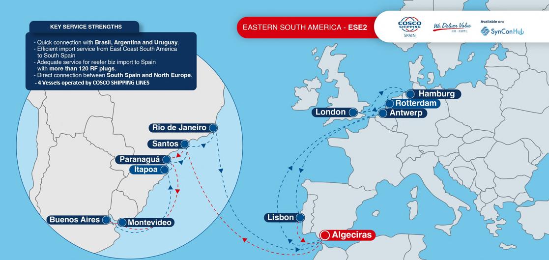 En la península ibérica, las escalas en los puertos de Algeciras (Cádiz) y de Lisboa permitirán a la compañía unir España y Portugal con la costa este de Sudamérica, ofreciendo una conexión rápida y destacando el tiempo de tránsito de 12 días entre Algeciras y Santos (Brasil), el cual será el más rápido del mercado. Además, este servicio es la única conexión directa que actualmente existe entre Lisboa y la costa este de Sudamérica.