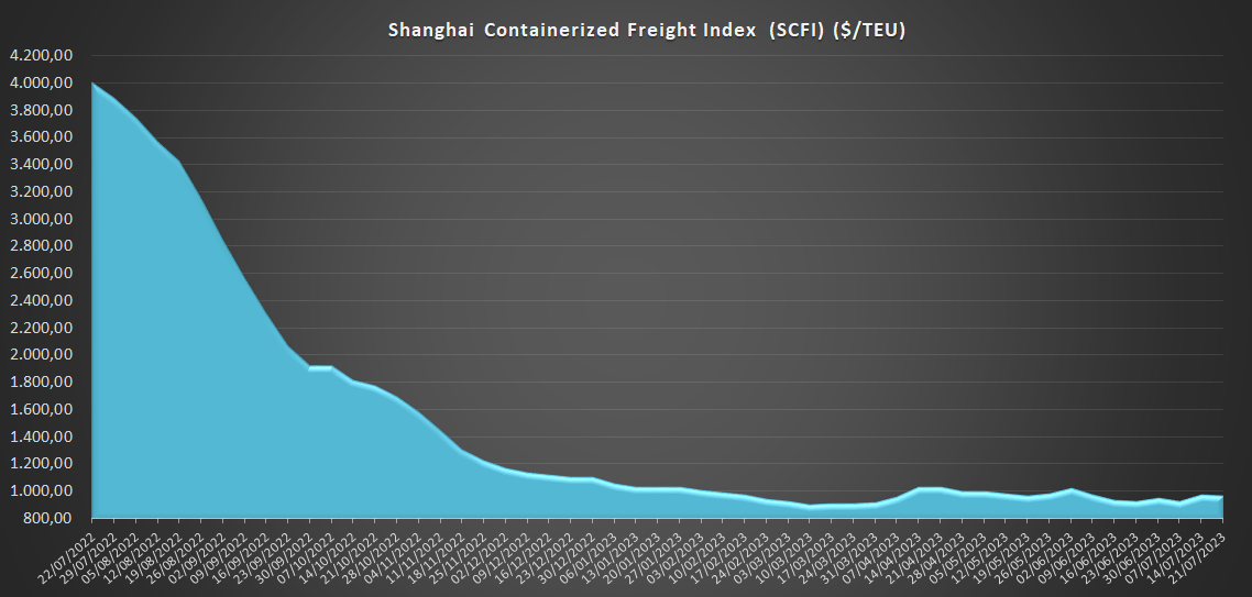 Con un valor de 966,45 USD/TEU, los fletes desde Shanghái (SCFI) reflejan hoy un descenso del -1,29% respecto a la semana anterior y una bajada del -75,8% en comparación con el mismo periodo de 2022. El índice se encuentra un 81% por debajo del pico de 5.109 USD, alcanzado en enero de 2022, aunque sigue siendo un 19% más alto que el promedio de 2019 (antes de la pandemia), situado en 811 USD.