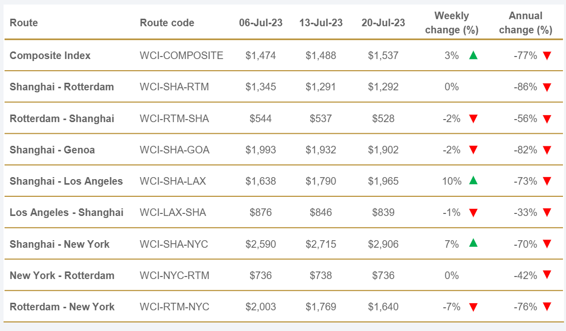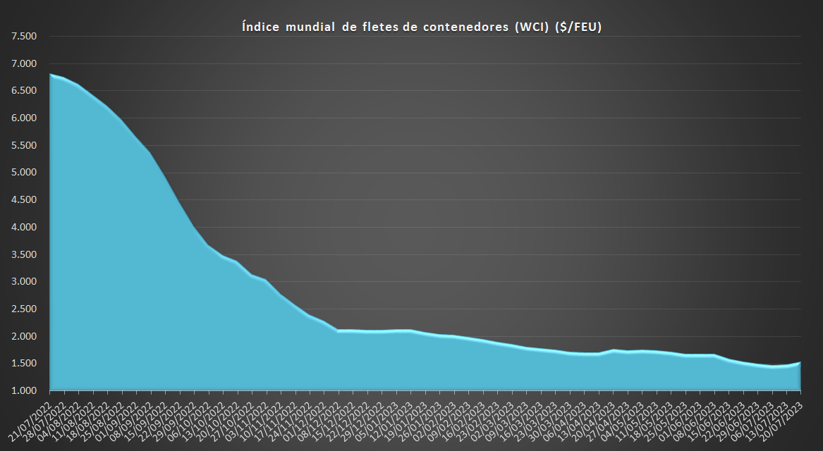Por su parte, el World Container Index (WCI), que evalúa el coste de los fletes en la principales rutas interoceánicas, se sitúa en 1.536,86 USD por contenedor de 40 pies, lo que supone una subida del 3,3% en relación a la semana anterior y un descenso del -77,5% con respecto al mismo periodo del año pasado. El índice se encuentra un 85% por debajo del pico de 10.377 USD, alcanzado en septiembre de 2021, y es un 8% más alto que el promedio de 2019 (antes de la pandemia) situado en 1.420 USD.