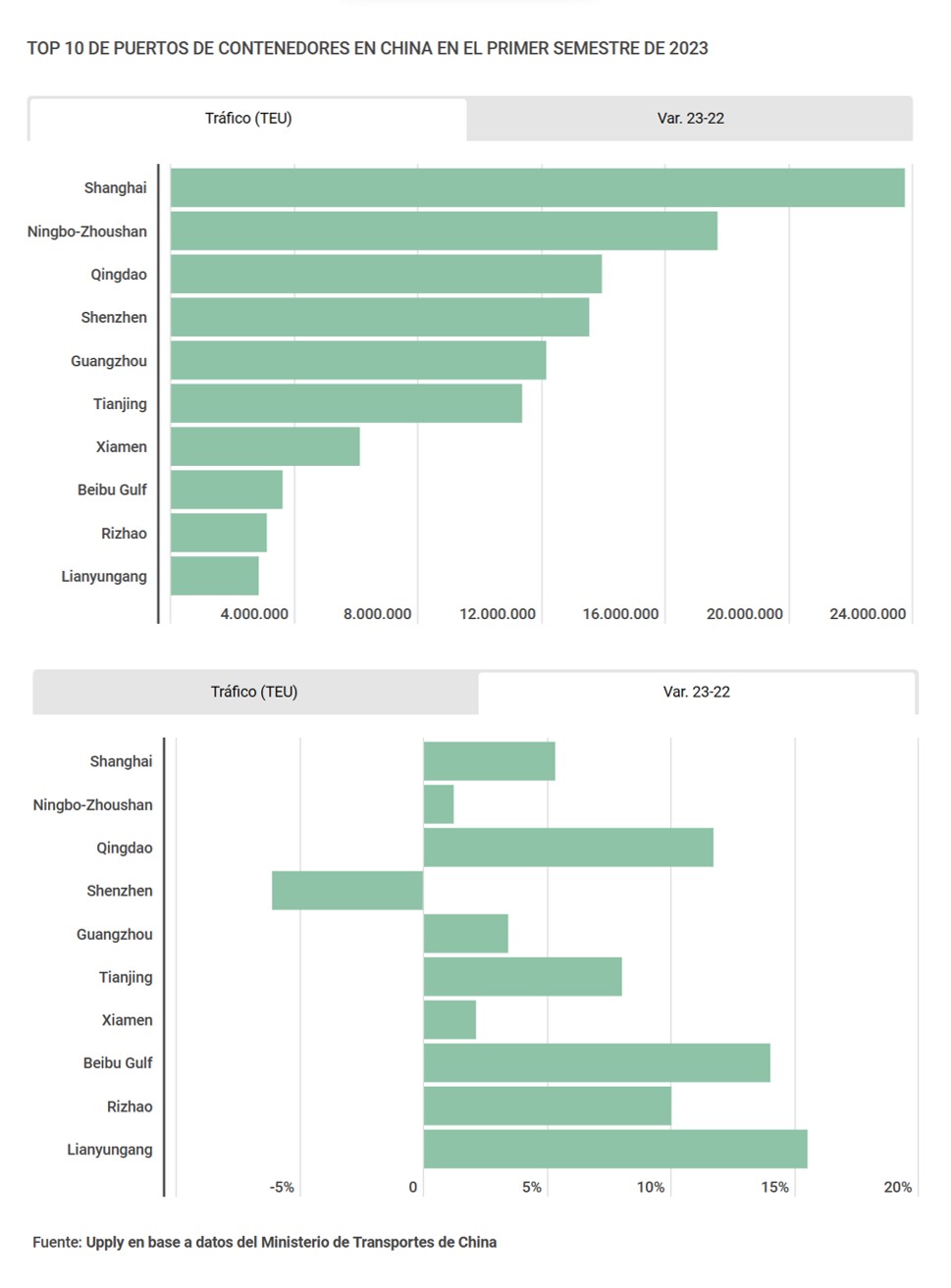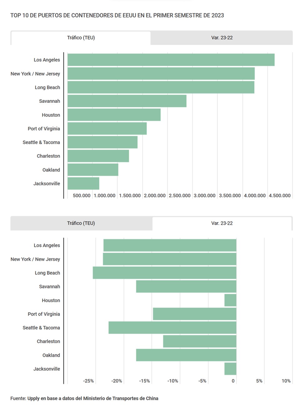 En el panorama internacional, frente al retroceso de las dársenas europeas, el de los puertos de Estados Unidos fue aún más pronunciado hasta junio, con una brusca caída interanual del 20% en el tráfico total de contenedores de los 10 grandes del país, hasta los 21,7 millones de teus, según la consultora Upply. Por su parte, China aguantó el tipo. Y es que sus 10 principales puertos manejaron 130,1 millones de teus en la primera mitad de 2023, el 4,2% más que en el mismo periodo de 2022.