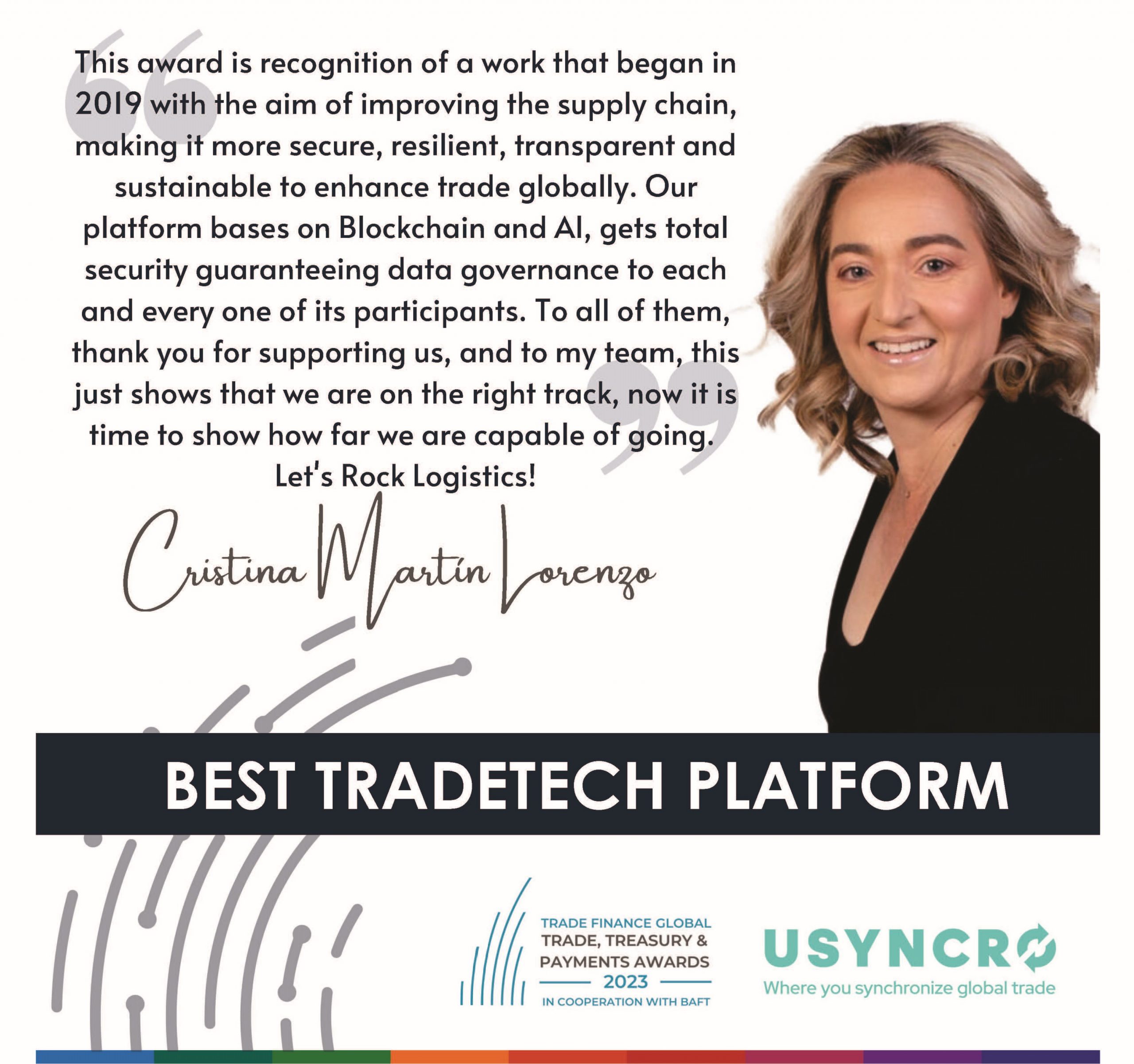 Cristina Martín Lorenzo, CEO de Usyncro, recogió el premio en presencia de Tod Burwell, presidente y CEO de BAFT. “Tenemos el objetivo de mejorar la gestión de la cadena de suministro haciéndola más segura, resiliente, transparente y sostenible. Un reto que sólo es posible gracias a la colaboración de todos los actores que intervienen la gestión de la cadena de suministro”, comentaba la CEO de Usyncro a la organización. “Sin perder competitividad ni la gobernanza del dato, la colaboración es fundamental para que autoridades, transportistas, fabricantes, entidades financieras, entre otros, sean más eficientes y generen sinergias para ser más competitivos en el comercio global”.