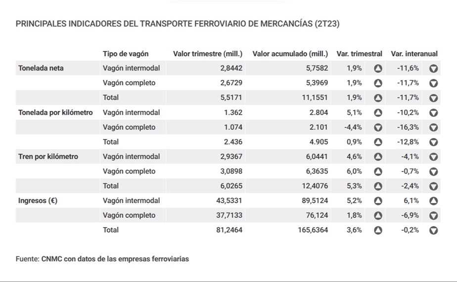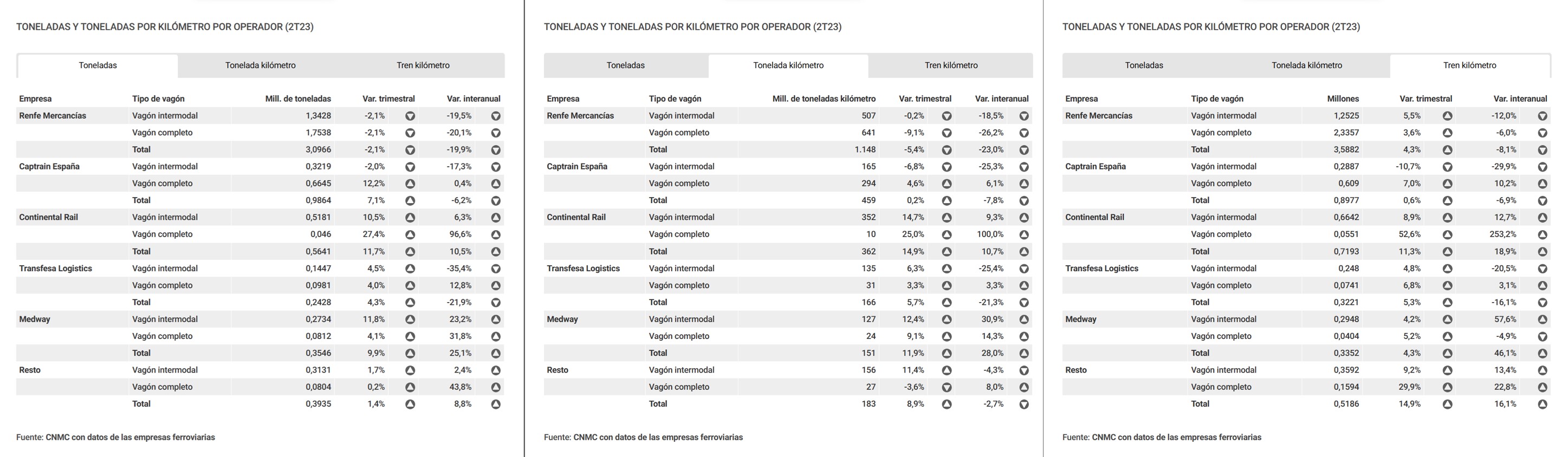 De hecho, el operador público se ha descolgado de la tendencia de mejora intertrimestral del sector y ha reflejado descensos del 0,2% en intermodal y del 9,1% en el vagón completo. También en las toneladas netas, donde la compañía sigue ostentando el 54,92% del mercado, se ha producido un descenso del 2,1% en sus resultados intertrimestrales. Comparado con 2022, el descenso total en toneladas kilómetro es del 23%, mientras que en toneladas netas ha quedado el 20% por debajo.