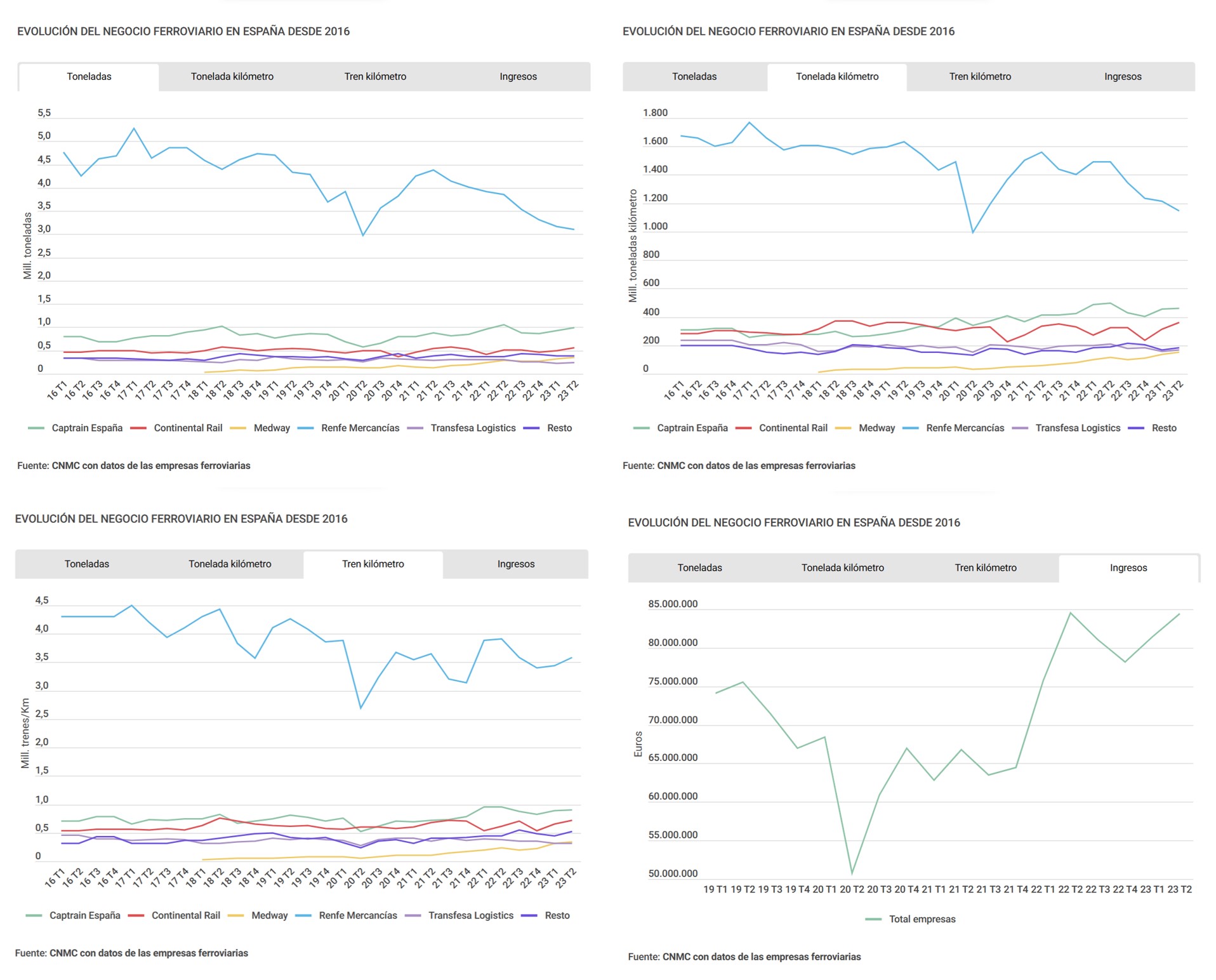 Según Juan Diego Pedrero, “los tráficos en los que Renfe estaba presente, los siderúrgicos e intermodales, son los que más han sufrido en la comparativa interanual”. El resto de empresas, en cambio, “tienen los tráficos más diversificados, les afecta la reducción de actividad, pero menos que a Renfe”. La prueba es el crecimiento intertrimestral de la mayoría de empresas alternativas al operador estatal, aunque la segunda, Captrain (SNCF), también refleja un descenso interanual acusado en sus tráficos intermodales de toneladas-kilómetro, del 6,8% (-2% en toneladas netas), y del 25,3% (-17,3% en toneladas netas) comparando con 2022.