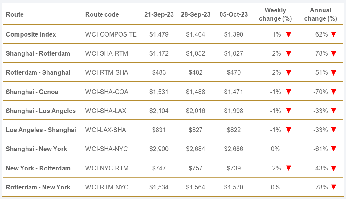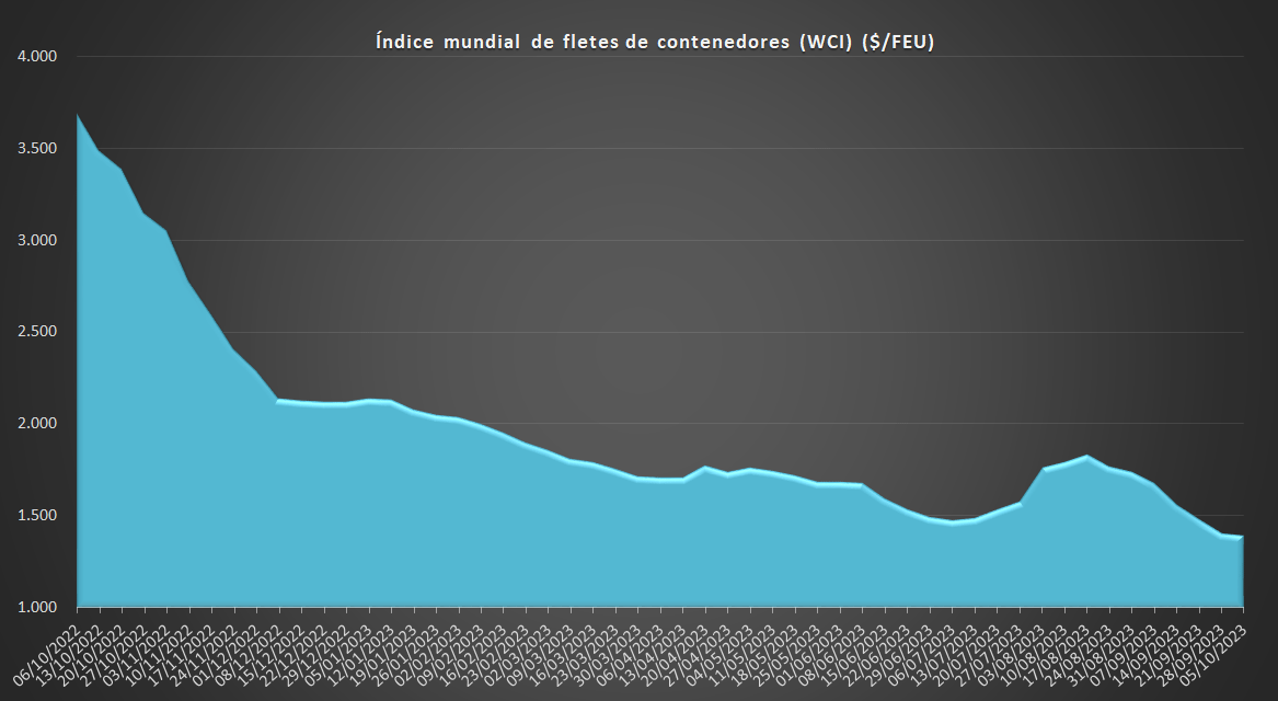 Aunque debido a la fiesta de la Semana Dorada China, este viernes no tenemos datos del SCFI, sabemos que el World Container Index (WCI), que evalúa el coste de los fletes en la principales rutas interoceánicas, se sitúa en 1.389,50 USD por contenedor de 40 pies, lo que supone una bajada del -1,1% en relación a la semana anterior y un descenso del -62,3 % con respecto al mismo periodo del año pasado. El índice está ya un -2% por debajo del promedio de 2019 (antes de la pandemia) situado en 1.420 USD.