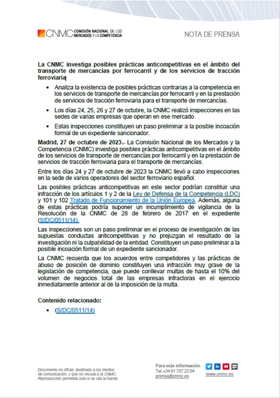La CNMC investiga posibles prácticas anticompetitivas en el ámbito del transporte de mercancías por ferrocarril y de los servicios de tracción ferroviaria