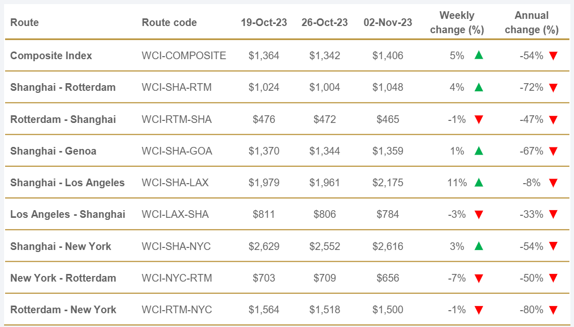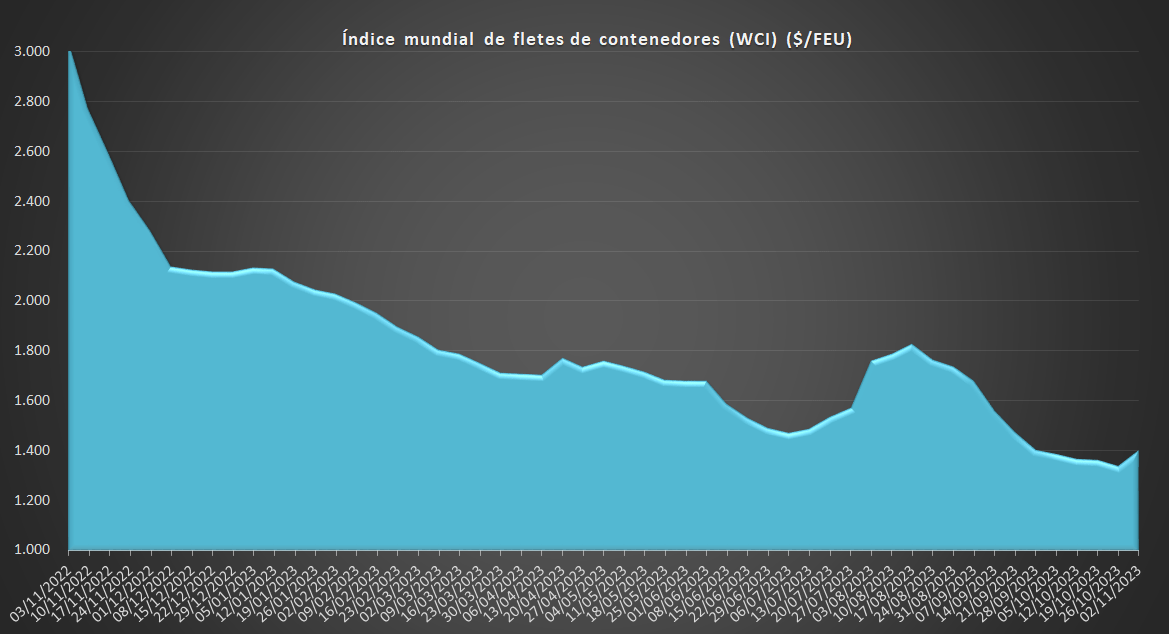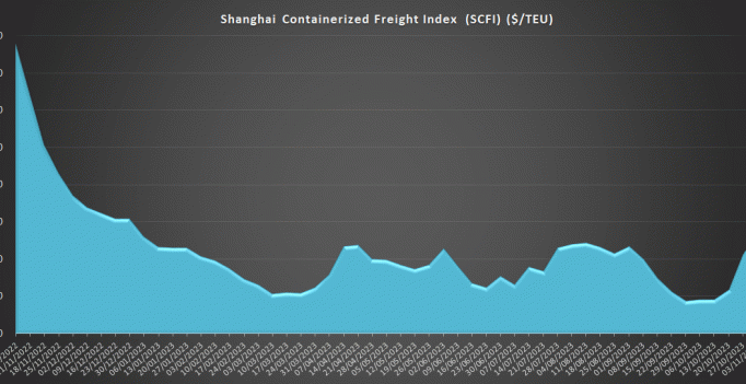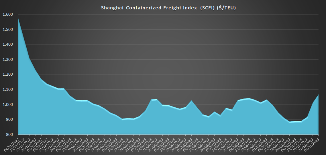 Con un valor de 1.067,88 USD/TEU, los fletes desde Shanghái (SCFI) reflejan hoy un ascenso del 5,5% respecto a la semana anterior y una bajada del 32,4% en comparación con el mismo periodo de 2022. El índice es un 32% más alto que el promedio de 2019 (antes de la pandemia), situado en 811 USD.