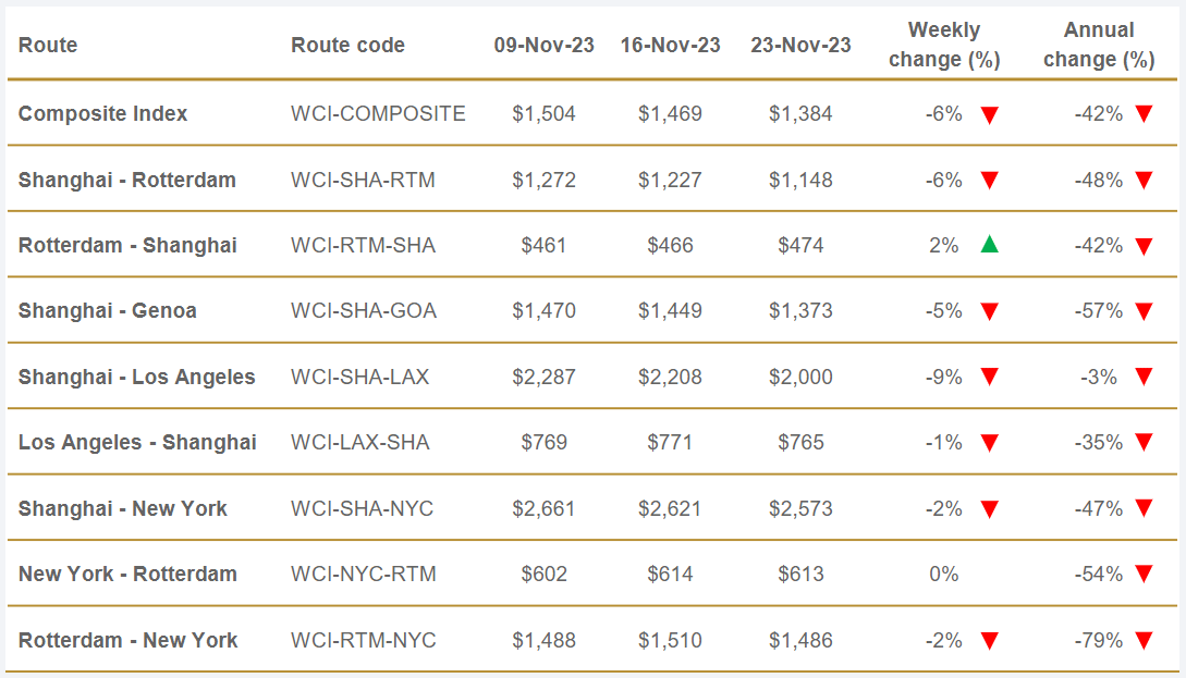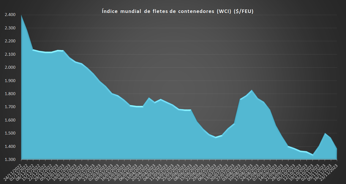 Por su parte, el World Container Index (WCI), que evalúa el coste de los fletes en la principales rutas interoceánicas, se sitúa en 1,384 USD por contenedor de 40 pies, lo que supone una bajada del 5,8% en relación a la semana anterior y un descenso del 42,2% con respecto al mismo periodo del año pasado. El índice es un 3% inferior al promedio de 2019 (antes de la pandemia) situado en 1.420 USD.