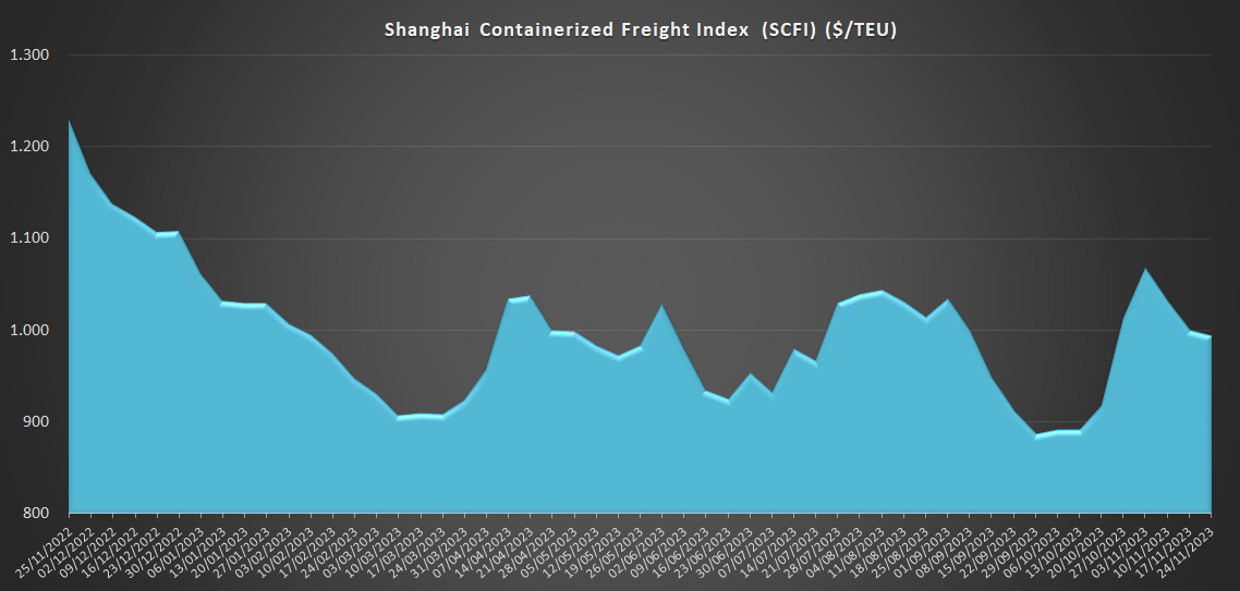 Con un valor de 993,21 USD/TEU, los fletes desde Shanghái (SCFI) reflejan hoy un descenso del 0,7% respecto a la semana anterior y una bajada del 19,2% en comparación con el mismo periodo de 2022. El índice es un 23% más alto que el promedio de 2019 (antes de la pandemia), situado en 811 USD.