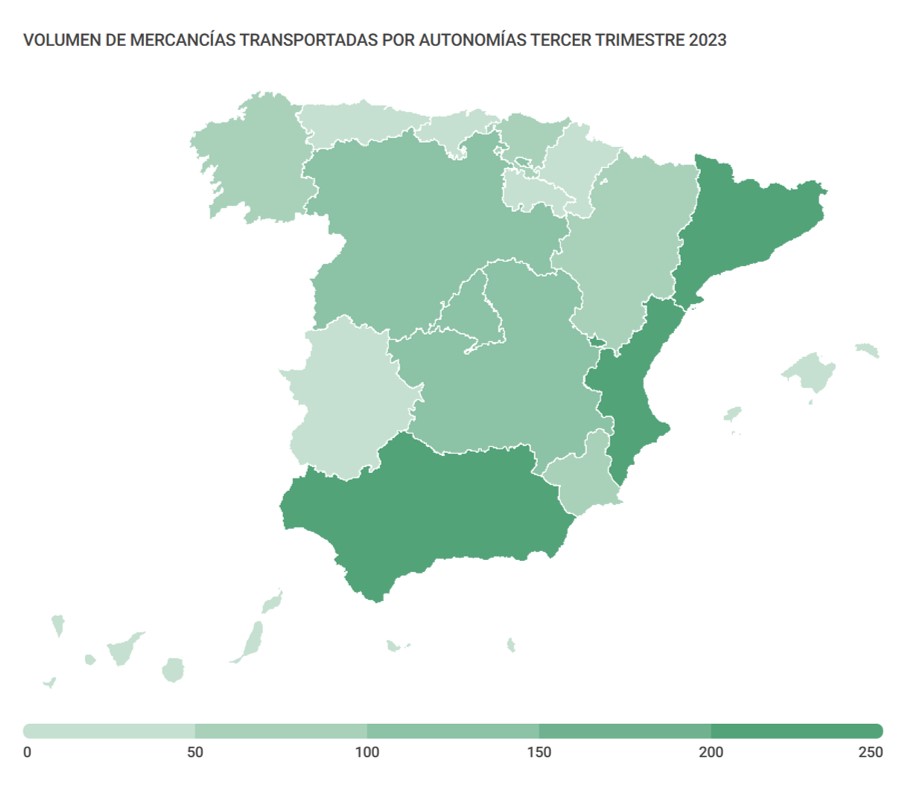 El volumen transportado en el tercer trimestre de 2023 se ha quedado en 387,5 millones de toneladas, lo que supone perder la cota de los 400 millones de toneladas registradas en los dos trimestres inmediatamente anteriores, según la Encuesta Permanente del Transporte por Carretera del ministerio de Transportes y Movilidad Sostenible. De hecho, las mercancías transportadas entre julio y septiembre de 2023 se encuentran tres puntos porcentuales por debajo del dato de 2022.