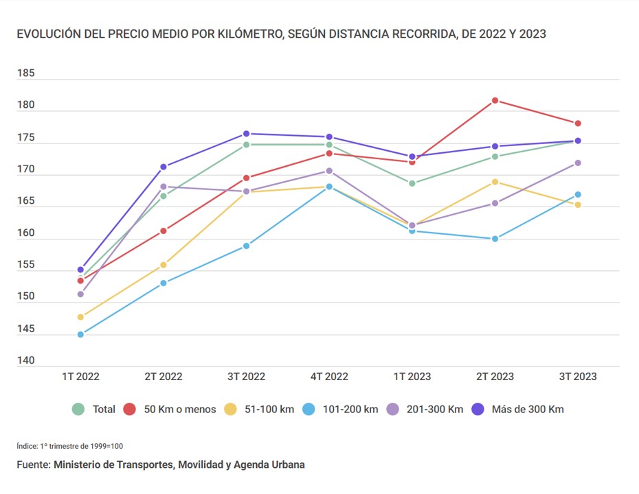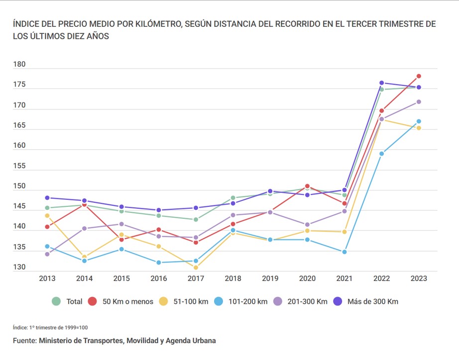 La media total de los precios en todos los recorridos en el tercer trimestre de 2023 muestran un incremento (+0,34%) en la comparativa interanual con el mismo periodo de 2022, momento en el que estalló la guerra en Ucrania y empezó a palparse el efecto inflacionario. Ese trimestre marcó, de hecho, un pico en la serie histórica, e inició una tendencia aún más pronunciada en la segunda mitad del año pasado. De entre todos los recorridos, ahora son los de 50 km o menos los que reflejan la subida más pronunciada, especialmente en la comparativa con el segundo trimestre de 2022 (+2,7%). Sin embargo, la media distancia (entre 101 y 200 km), la distancia entre 50 y 100 km y la larga distancia (más de 300 km) arrojan una disminución en la variación interanual de -0,71%, -1,72% y de -0,34%, respectivamente. Si se comparan estos datos con el trimestre anterior, solo los recorridos de menos de 50 kilómetros y los recorridos entre 51 y 100 reflejan descensos.