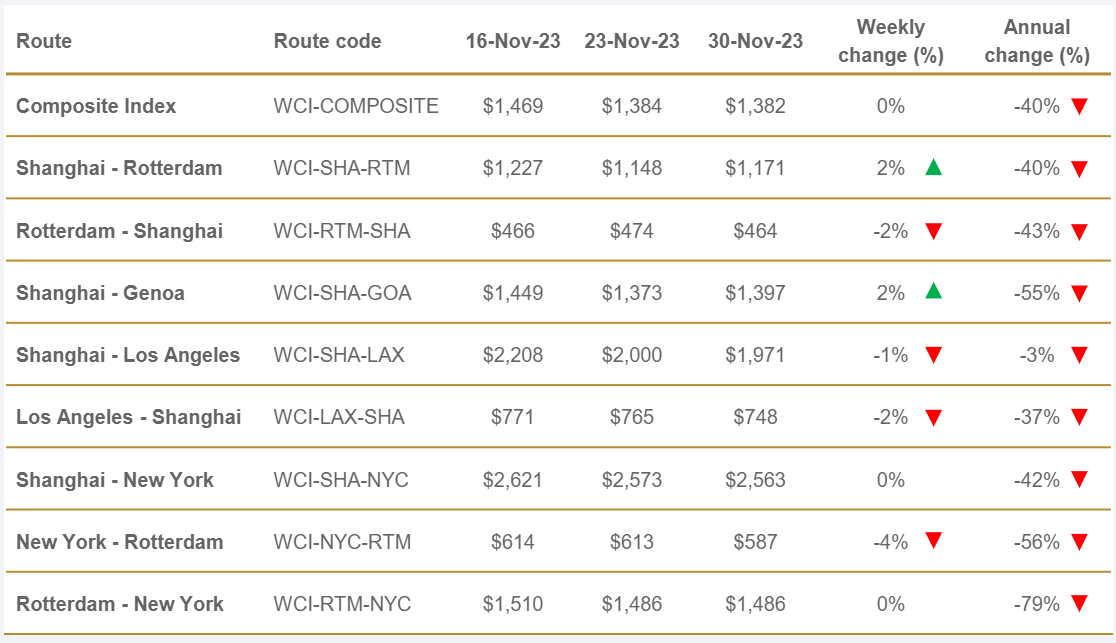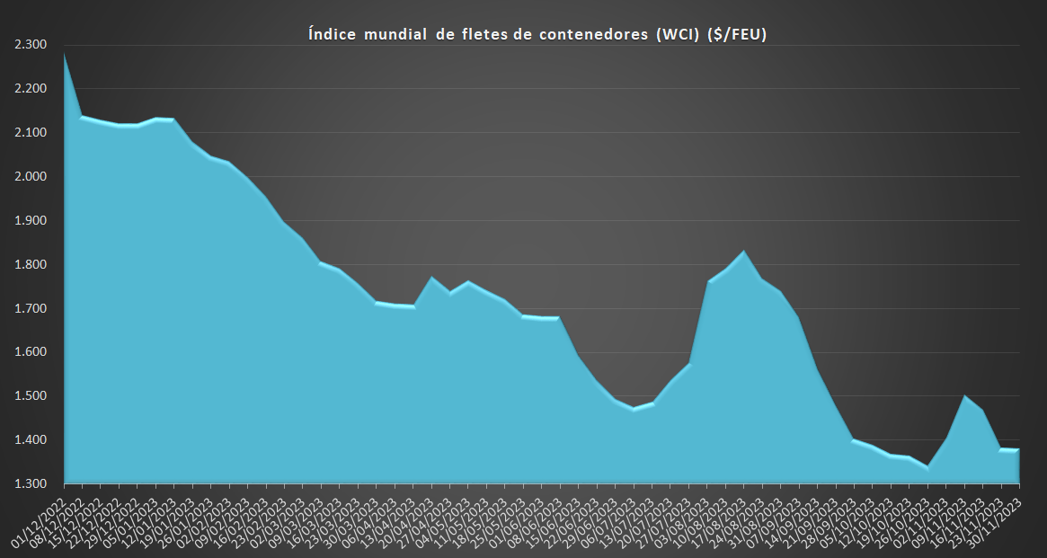 Por su parte, el World Container Index (WCI), que evalúa el coste de los fletes en la principales rutas interoceánicas, se sitúa en 1,382 USD por contenedor de 40 pies, lo que supone una bajada del 0,1% en relación a la semana anterior y un descenso del 39,5% con respecto al mismo periodo del año pasado. El índice es un 3% inferior al promedio de 2019 (antes de la pandemia) situado en 1.420 USD.