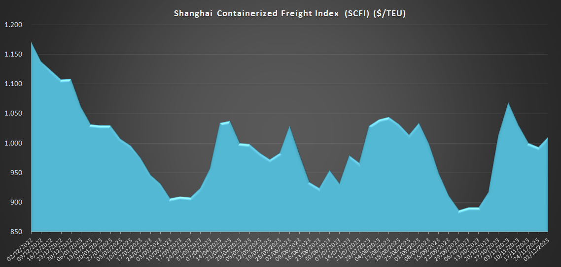 Con un valor de 1010,81 USD/TEU, los fletes desde Shanghái (SCFI) reflejan hoy un ascenso del 1,7% respecto a la semana anterior y una bajada del 13,7% en comparación con el mismo periodo de 2022. El índice es un 24% más alto que el promedio de 2019 (antes de la pandemia), situado en 811 USD.