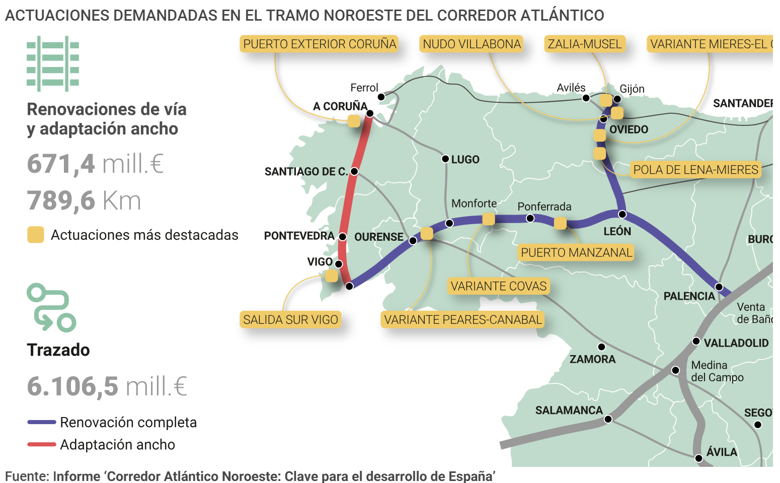 Según el informe ‘Corredor Atlántico Noroeste: Clave para el desarrollo de España’, elaborado por los gobiernos autonómicos de Asturias, Castilla y León y Galicia, la inversión “podría ser financiada en buena parte con fondos europeos”. En su reciente presentación pública en Madrid, el presidente de la CEOE, Antonio Garamendi, destacó “la importancia del Corredor Atlántico para una adecuada vertebración y cohesión económica, social y territorial del noroeste peninsular que, por extensión, será beneficioso para el resto del país”.