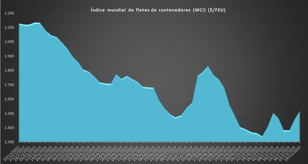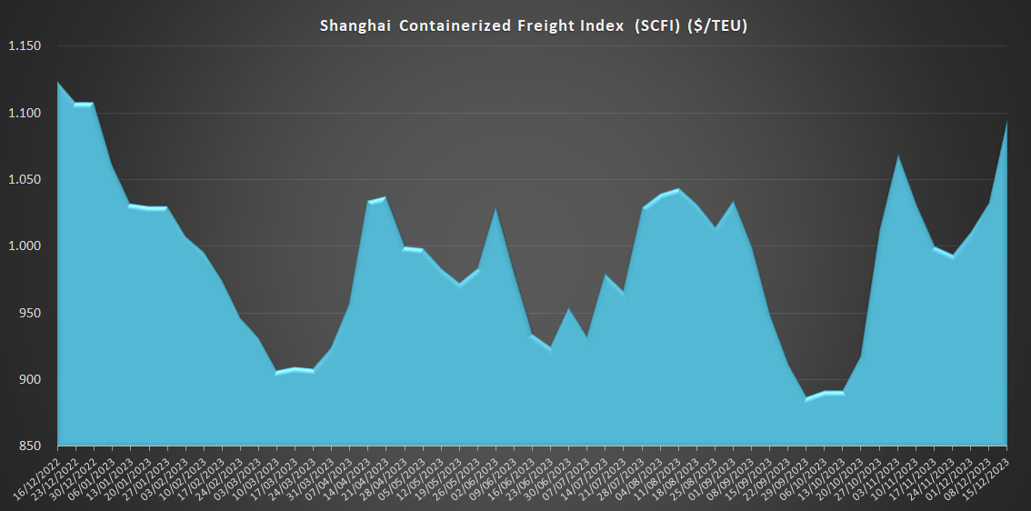Con un valor de 1.093,52 USD/TEU, los fletes desde Shanghái (SCFI) reflejan hoy un ascenso del 5,9% respecto a la semana anterior y una bajada del 2,6% en comparación con el mismo periodo de 2022. El índice es un 35% más alto que el promedio de 2019 (antes de la pandemia), situado en 811 USD.