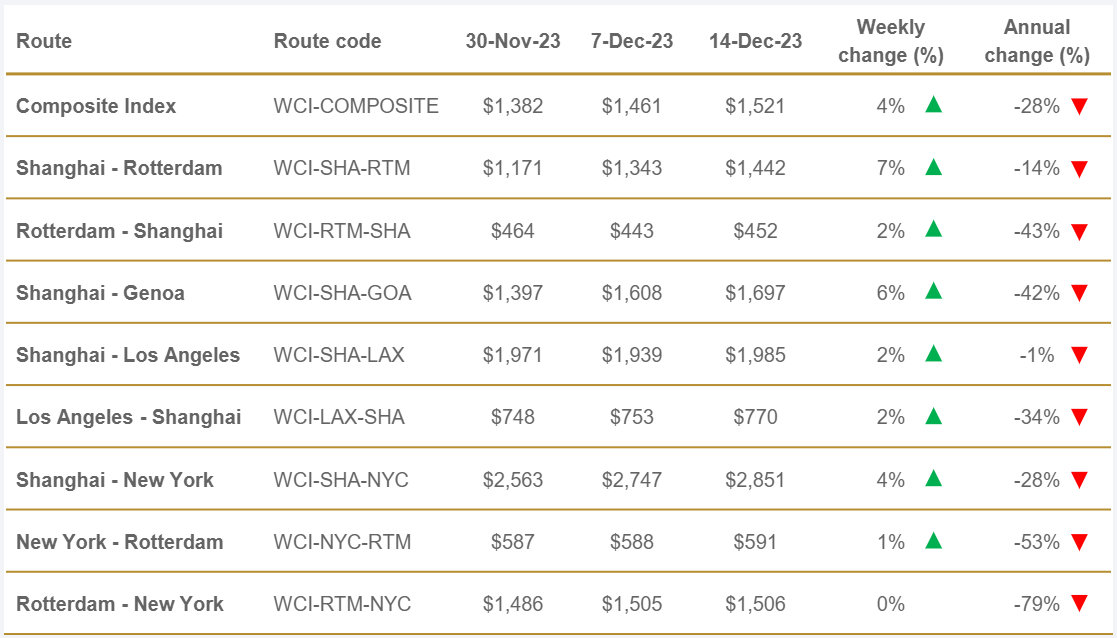 Por su parte, el World Container Index (WCI), que evalúa el coste de los fletes en la principales rutas interoceánicas, se sitúa en 1.521 USD por contenedor de 40 pies, lo que supone una subida del 4,1% en relación a la semana anterior y un descenso del 28,5% con respecto al mismo periodo del año pasado. El índice es un 7% superior al promedio de 2019 (antes de la pandemia) situado en 1.420 USD.