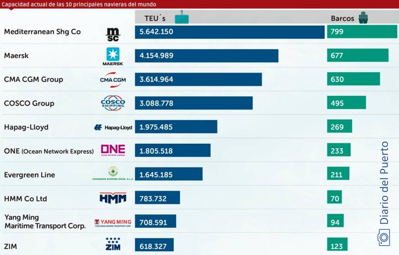 Hapag-Lloyd, que suma 1,97 millones de TEUs (39,7% en flota alquilada), ocupa la quinta posición entre las principales navieras, seguida por ONE (Ocean Network Express) con 1,80 millones de TEUs de capacidad (56,6% alquilada) y Evergreen, que cierra el ranking de las navieras que superan el millón de unidades de capacidad, con 1,64 millones de TEUs, de los que el 41,3% pertenecen a flota alquilada por parte de la compañía taiwanesa. Con estos datos, MSC gestiona el 19,80% de la capacidad de la flota mundial de contenedores, Maersk un 14,6%, CMA CGM un 12,7% y COSCO un 10,8%, y son las únicas navieras que superan el 10% de la capacidad, según Alphaliner.