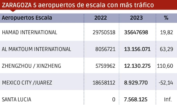 Los aeropuertos que más crecieron por volumen de kilos en 2023 fueron Madrid con 77,13 millones de kilos más y Zaragoza con 2,78 millones de kilos más, seguidos de Gran Canaria con 1,24 millones de kilos más, Sevilla con 947.876 kilos más y Barcelona con 885.523 kilos más.
