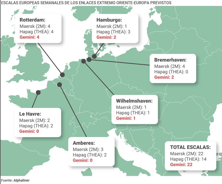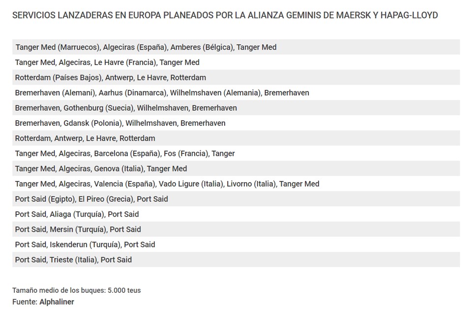 Por su parte, “Amberes (Bélgica), Le Havre (Francia), Gdansk (Polonia), Gotemburgo (Suecia) y Aarhus (Dinamarca), todos ellos servidos actualmente por Maersk y/o Hapag-Lloyd con portacontenedores de entre 15.000 y 24.000 teus, ya no recibirán escalas desde Extremo Oriente de Cooperación Géminis”, expone Alphaliner. Tanto Amberes como Le Havre serán atendidos vía transbordo desde Tanger Med y/o Algeciras, aunque los principales puertos belga y francés tendrán servicios feeder por separado.