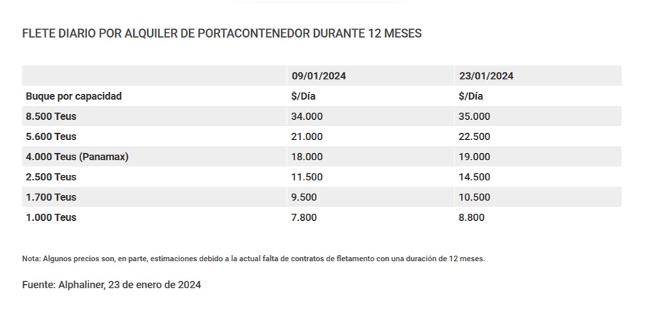 El interés de los armadores por los panamax clásicos, de entre 4.000 y 5.299 teus, tampoco muestra signos de debilitamiento. Aunque el repunte de los fletes comenzó antes de los ataques de los hutíes en el Mar Rojo, la recuperación está cobrando impulso. Según Alphaliner, los últimos fletamentos de unidades de 4.250 teus se han pagado 19.000 dólares diarios por periodos de hasta 12 meses, lo que “es un precio es muy superior al anterior de 18.000 dólares”. Por su parte, los panamax más grandes de 5.000 teus se fijan en 20.000 dólares por períodos cortos.