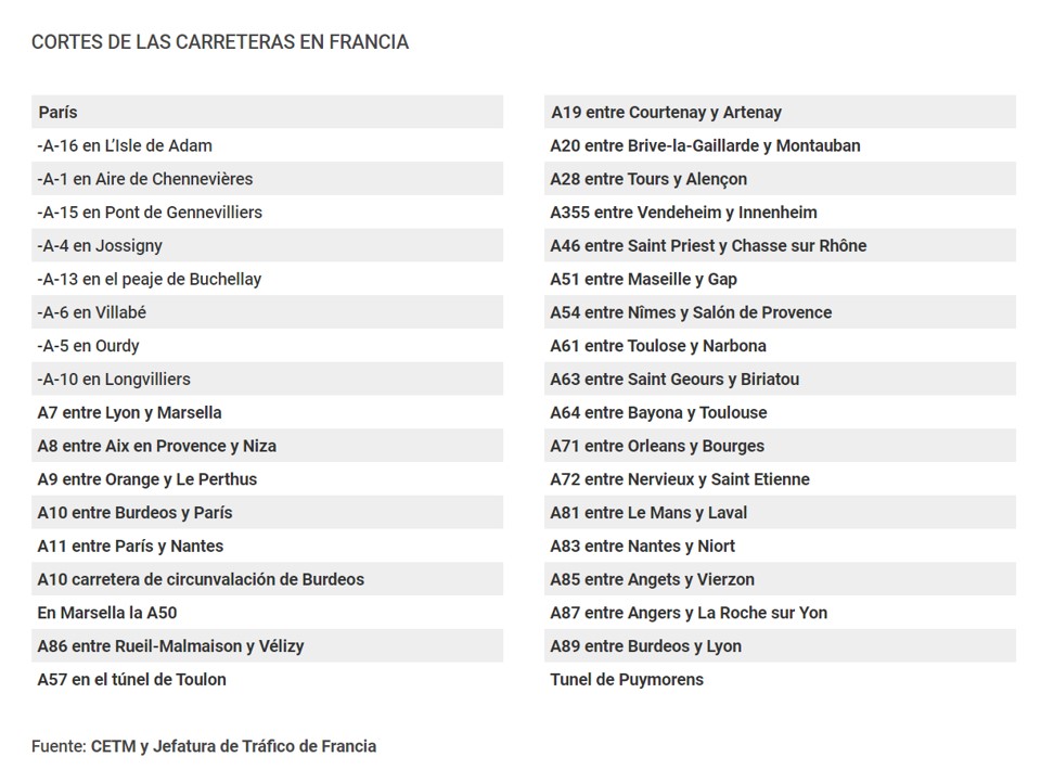 La confederación española de transporte asegura que el balance de protestas durante el fin de semana se redujo y ello permitió la circulación por vías alternativas el sábado por la mañana, especialmente tras la reapertura de la AP-7. No obstante, la variabilidad de rutas es muy limitada porque Francia también es la vía de salida hacia otros países, como Alemania y Reino Unido. Al igual que el CNTC, desde CETM tampoco pueden asegurar a los conductores que el tránsito por vías secundarias sea seguro. “Les llevará más tiempo y también pueden encontrarse con bloqueos”, explican fuentes de la confederación. Además, señalan que “estamos teniendo conocimiento a través de nuestros asociados, de que el Gobierno francés está reclamando a los transportistas españoles que han sido atacados un pago asociado a los servicios de limpieza que se realizan en las autopistas, lo que nos parece una humillación absoluta”.