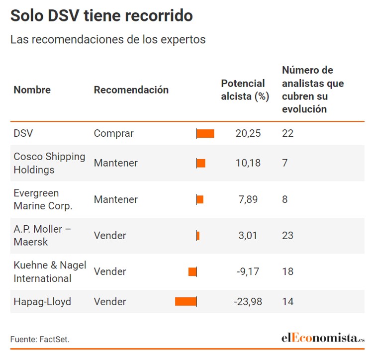 Pero el fuerte repunte de estas últimas sesiones ha dejado sin potencial alcista a la mayor parte de estos valores. El consenso de mercado que recoge FactSet fija el precio objetivo en las 12.850 coronas danesas (1.733 euros por acción al cambio) que ya superó la semana pasada. Hapag-Lloyd y Kuehne & Nagel se encuentran en la misma situación (aunque no se dediquen exclusivamente al transporte marítimo). En este punto es DSV, otra compañía danesa enfocada en el transporte y logística, la que mayor recorrido por delante tiene en el mercado hasta los 197,05 euros al cambio. Además, es la única que cuenta con una recomendación de compra, según los expertos.