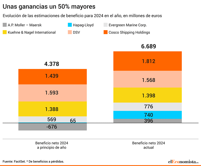 Por su parte, Maersk es la clara beneficiada del conflicto al ver como los expertos han mejorado sustancialmente sus previsiones de ganancias de cara a 2024. Concretamente, las firmas de inversión han dejado de esperar pérdidas para este año, como lo hacían de media hace apenas unas semanas, para estimar que la firma danesa obtendrá beneficios netos al superar los casi 400 millones de euros (hace tres semanas se esperaba un resultado neto de solo 128 millones de euros).