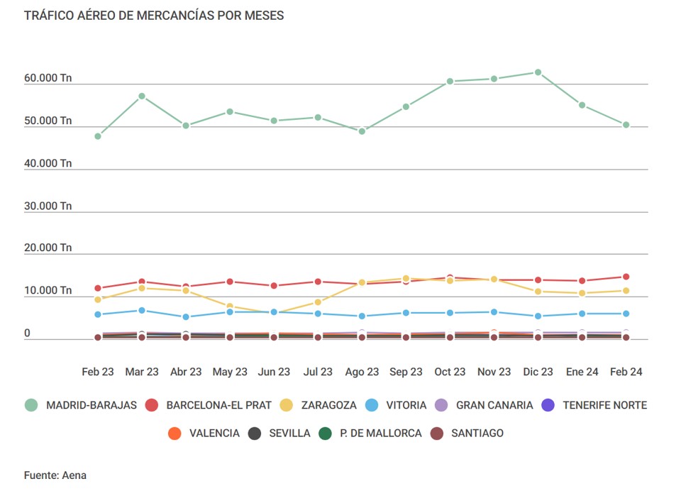 Madri-Barajas ha registrado un volumen de 50.271 toneladas, lo que supone un ascenso del 20% respecto a febrero del año pasado, y de hasta el 39% respecto al mismo mes del ejercicio prepandemia. Por su parte, Barcelona-El Prat ocupa el segundo lugar en febrero, con un total de 14.703 toneladas, el 22,5% respecto a febrero de 2023, y el 19% más respecto a 2019. El tercer puesto corresponde a Zaragoza, con 11.317 toneladas gestionadas y un aumento del 23% respecto a febrero de 2023. Sin embargo, los resultados en la comparativa con el año prepandemia son negativos, puesto que la cifra de este febrero es el 19,1% inferior a la del mismo mes de 2019. Es llamativa también la cifra del aeropuerto de Vitoria que movió en febrero 6.050 toneladas, si bien comparándolo con el año pasado supone el 5,9% más, si comparamos con 2019 el crecimiento es del 23,1%.