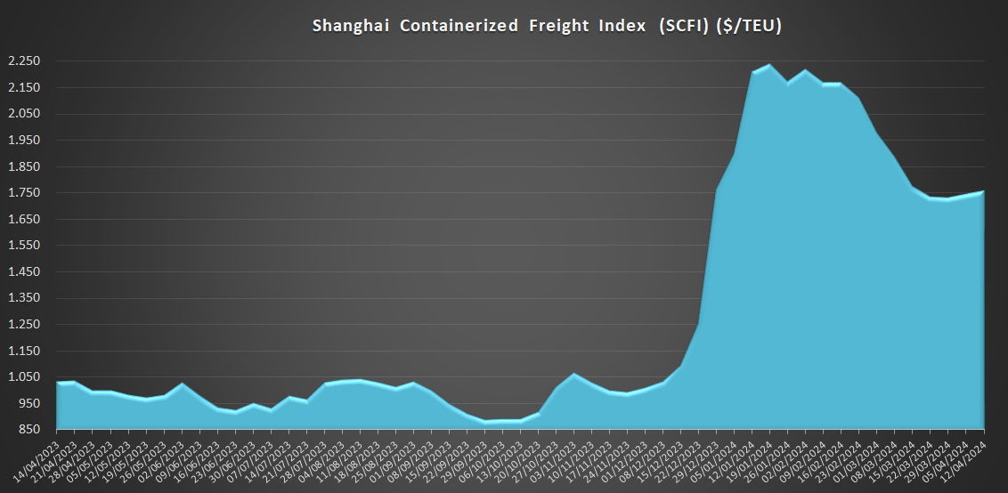 Con un valor de 1.757,04 USD/TEU, los fletes desde Shanghái (SCFI) reflejan hoy un ligero ascenso del 0,7% respecto a la semana anterior y un incremento del 84% en comparación con el mismo periodo de 2023. El índice es un 117% más alto que el promedio de 2019 (antes de la pandemia), situado en 811 USD.