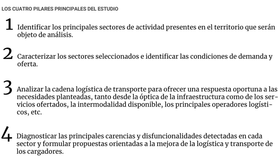 Según ha detallado el Principado de Asturias, el estudio se sustentará sobre cuatro pilares principales: identificar los principales sectores de actividad presentes en el territorio que serán objeto de análisis; caracterizar los sectores seleccionados e identificar las condiciones de demanda y oferta; analizar la cadena logística de transporte para ofrecer una respuesta oportuna a las necesidades planteadas, tanto desde la óptica de la infraestructura como de los servicios ofertados, la intermodalidad disponible, los principales operadores logísticos, etc; y diagnosticar las principales carencias y disfuncionalidades detectadas en cada sector y formular propuestas orientadas a la mejora de la logística y transporte de los cargadores.