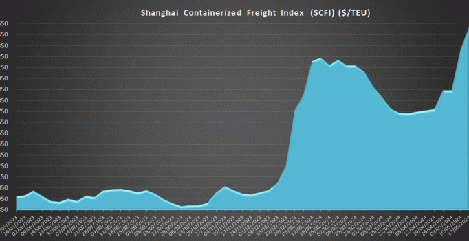 Con un valor de 2.520,76 USD/TEU, los fletes desde Shanghái (SCFI) reflejan hoy un ascenso del 9,32% respecto a la semana anterior y un incremento del 159% en comparación con el mismo periodo de 2023. El índice es un 211% más alto que el promedio de 2019 (antes de la pandemia), situado en 811 USD.