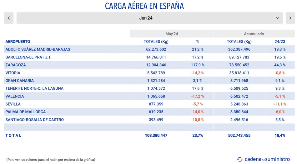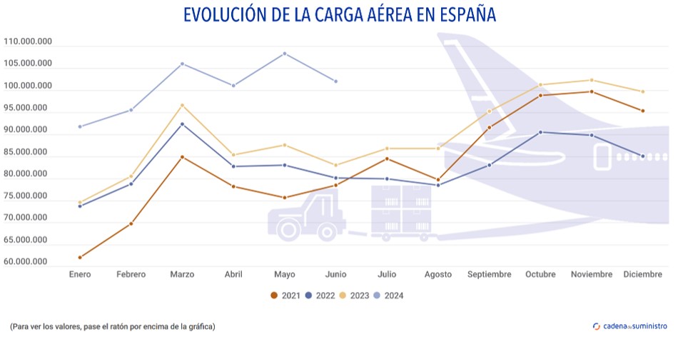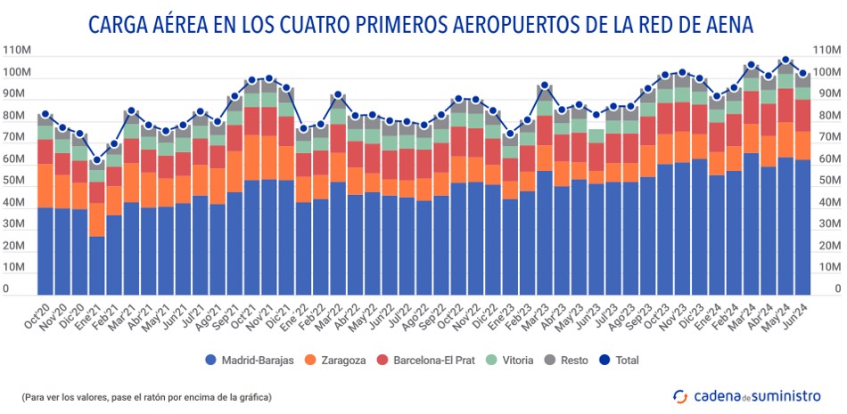 Durante el pasado mes de junio, el sistema aeroportuario español ha movido un volumen mensual de 102.037.162 kg de mercancías, un 22,9% más que en el quinto mes de 2023.