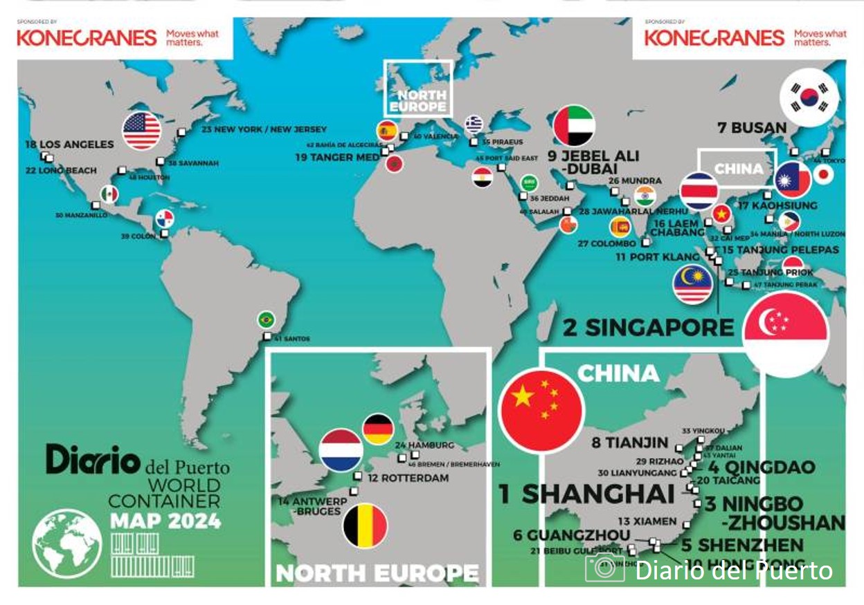 Shanghai lideró en 2024 una vez más el ranking mundial de puertos en función del tráfico de contenedores, con un nuevo récord de 49,15 millones de TEUs manipulados y un crecimiento del 4%, seguido de Singapur con 39,01 millones de TEUs (+4,6%) y de Ningbo-Zhousan con 35,3 millones de TEUs y un crecimiento del 5,8%.