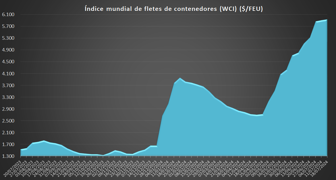 Por su parte, el World Container Index (WCI), que evalúa el coste de los fletes en la principales rutas interoceánicas, se sitúa en 5.937 USD/TEU por contenedor de 40 pies, lo que supone un incremento del 0,61% en relación a la semana anterior. El flete es un 43% inferior al pico de 10.377 USD/TEU alcanzado en septiembre de 2021, pero un 286% superior respecto al mismo periodo del año pasado. El índice es un 318% superior al promedio de 2019 (antes de la pandemia) situado en 1.420 USD/TEU.