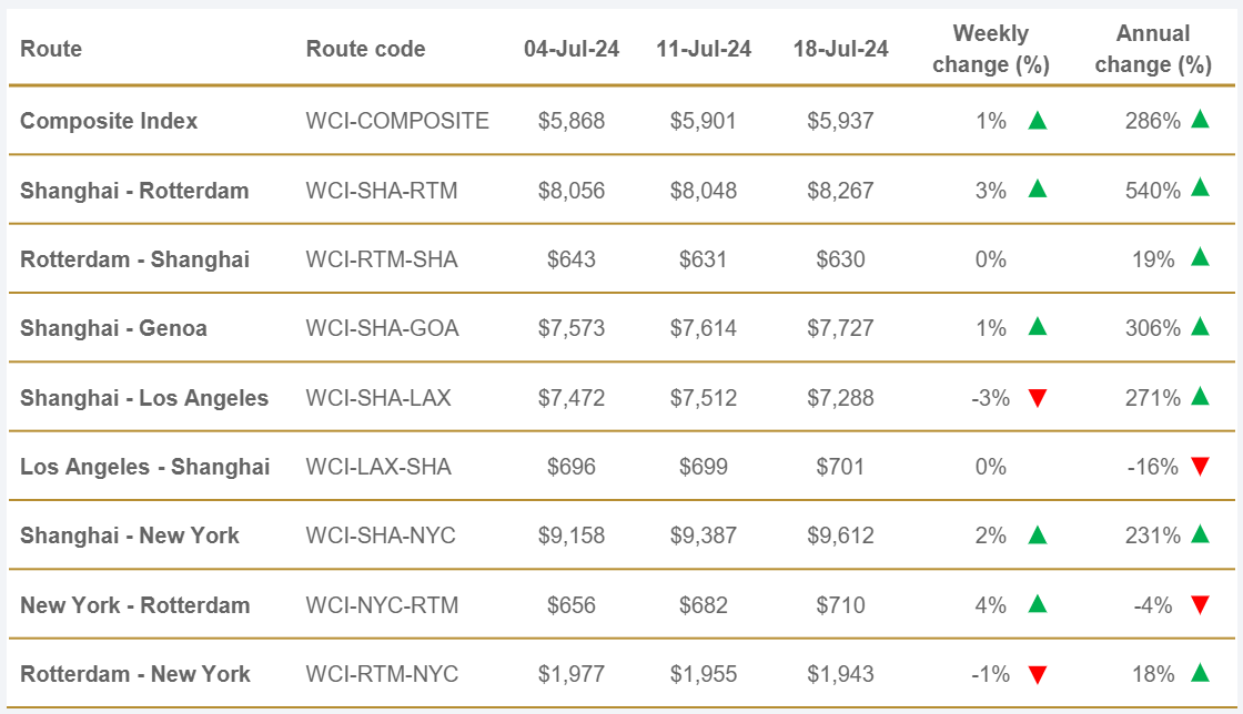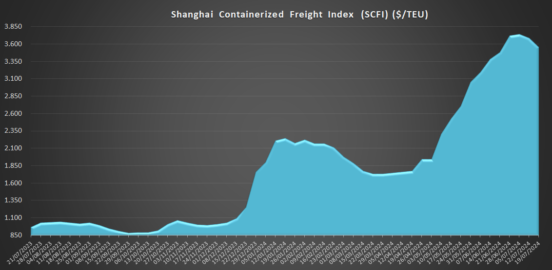 Con un valor de 3.542,44 USD/TEU, los fletes desde Shanghái (SCFI) reflejan hoy un descenso del -3,6% respecto a la semana anterior y un incremento del 262% en comparación con el mismo periodo de 2023. El índice es un 337% más alto que el promedio de 2019 (antes de la pandemia), situado en 811 USD.