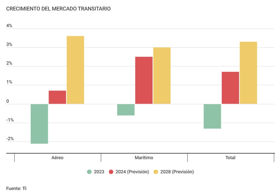 La consultora prevé que el mercado transitario aéreo crezca a una tasa interanual del 3,6% durante este periodo. Por su parte, el negocio transitario marítimo haga lo propio a un ritmo similar, en torno al 3% de aquí a 2028. En el caso del aéreo, Transport Intelligence destaca la diferencia de crecimiento previsible que se producirá este año, que será del 0,7%, y que se traducirá en un valor de mercado de 196.018 millones de euros. “La Asociación Internacional de Transporte Aéreo (IATA) afirma que el aumento del comercio electrónico entre Asia y Europa, en particular, será responsable del dinamismo del tráfico internacional, que se reflejará en la demanda de carga aérea”, afirma el análisis de la consultora británica.