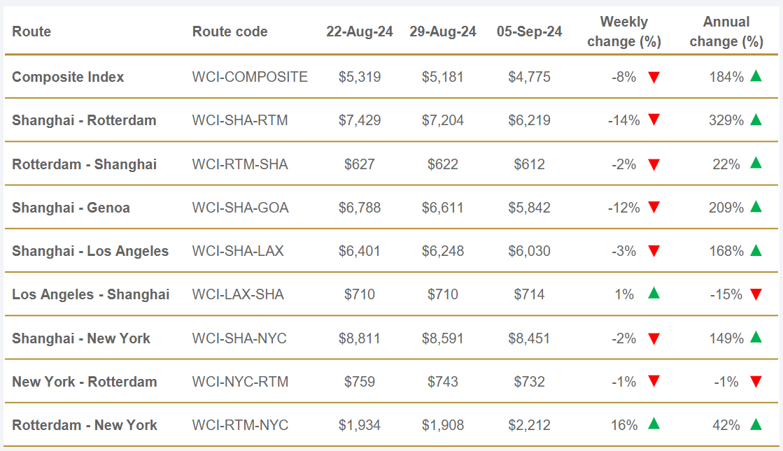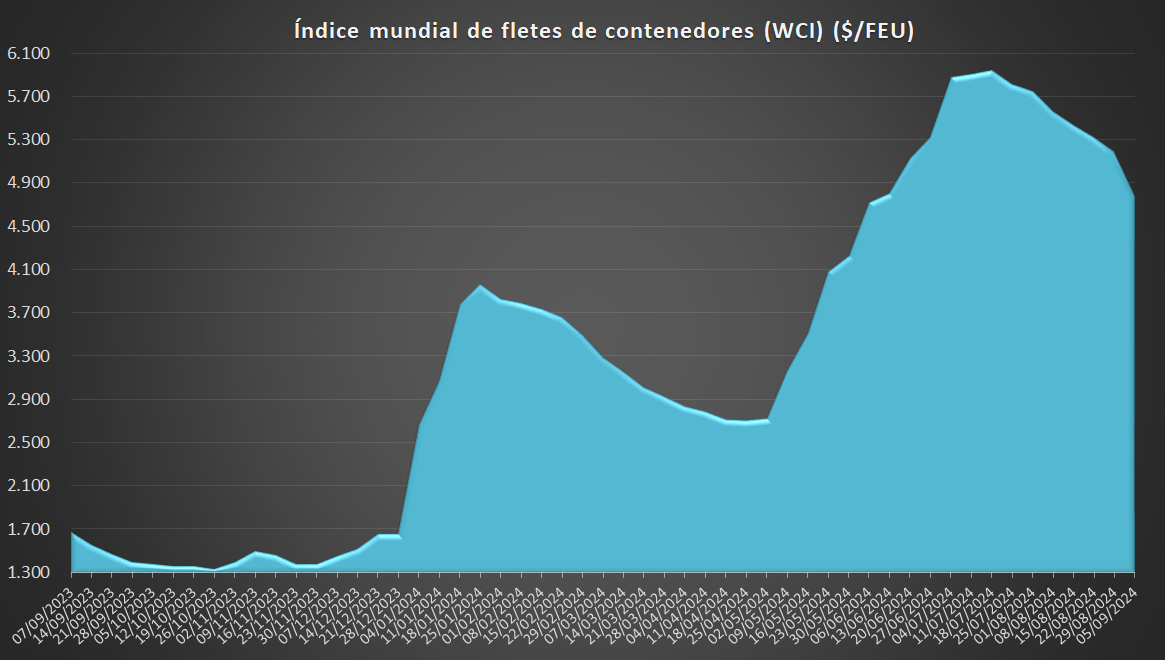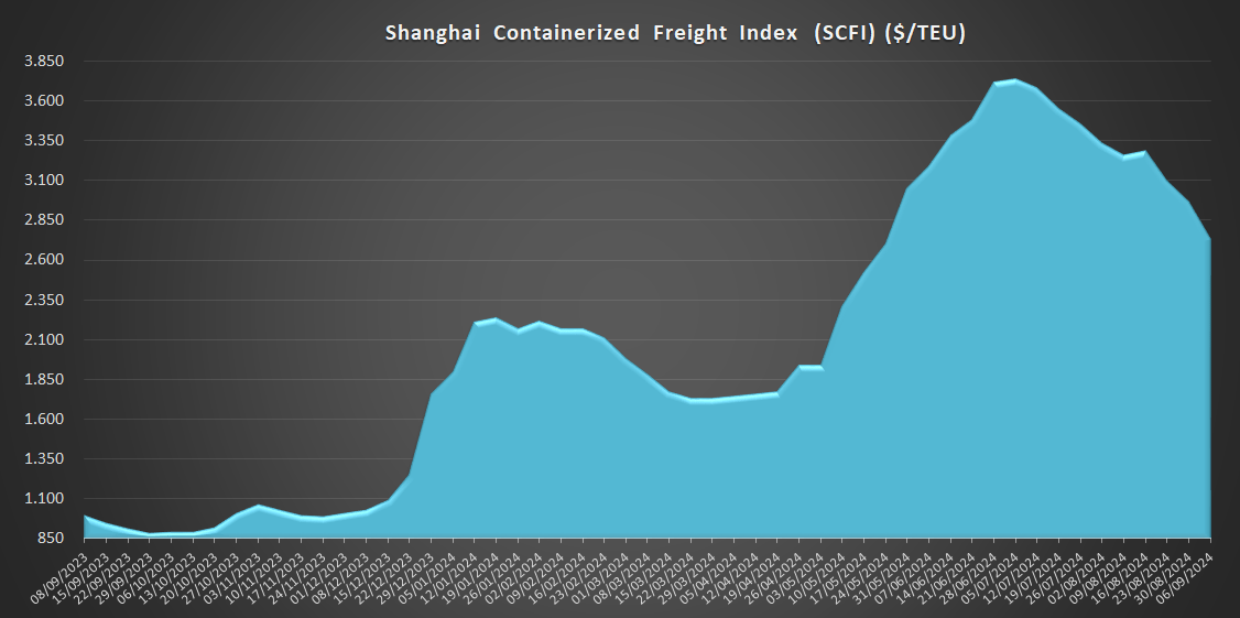 Con un valor de 2.726.58 USD/TEU, los fletes desde Shanghái (SCFI) reflejan hoy un descenso del -7,9% respecto a la semana anterior y un incremento del 173% en comparación con el mismo periodo de 2023. El índice es un 336% más alto que el promedio de 2019 (antes de la pandemia), situado en 811 USD.