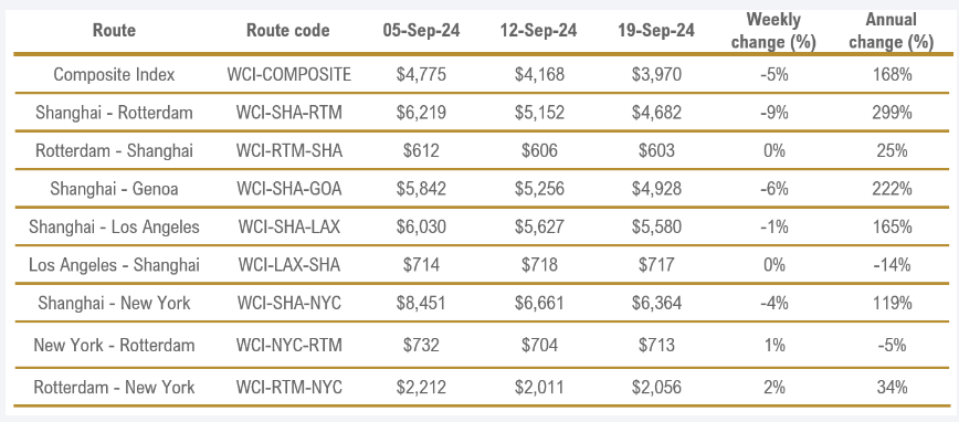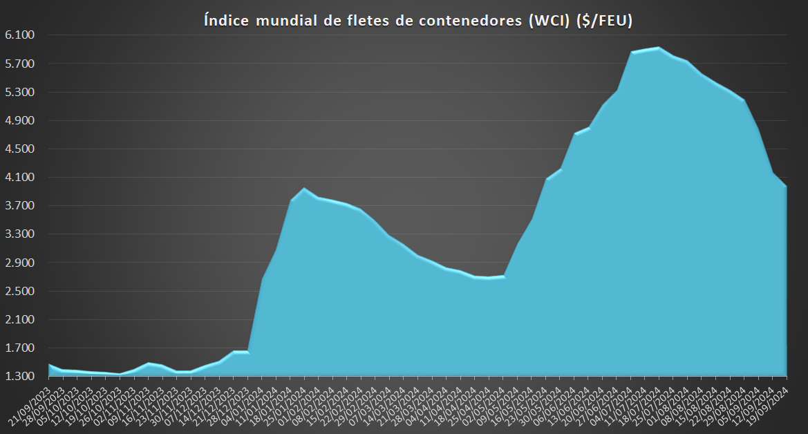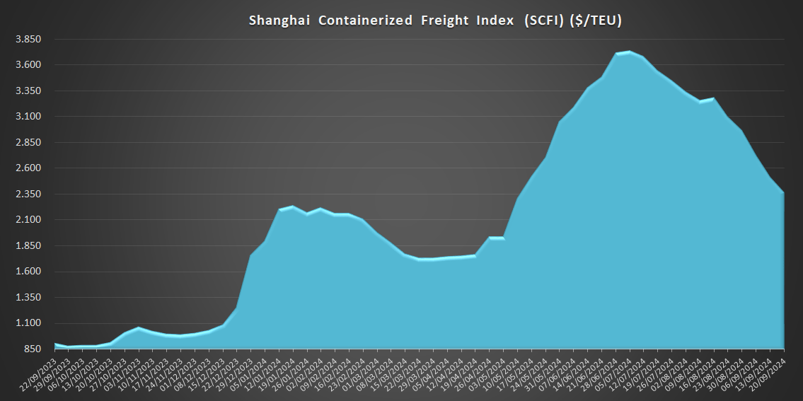 Con un valor de 2.366,24 USD/TEU, los fletes desde Shanghái (SCFI) reflejan hoy un descenso del -5,8% respecto a la semana anterior. El flete es un 160% superior al mismo periodo de 2023 y un 191% más alto que el promedio de 2019 (antes de la pandemia), situado en 811 USD.
