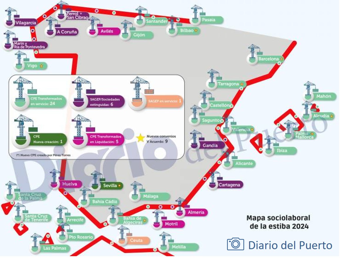 Dicho esto, el mapa societario ha seguido evolucionando en estos años y de los 29 CPEs constituidos, ahora mismo hay un total de 5 que están en proceso de liquidación, es decir, van camino igualmente de la extinción. Estos CPEs son los correspondientes a los puertos de Almería, Avilés, Huelva, Motril y Sevilla.