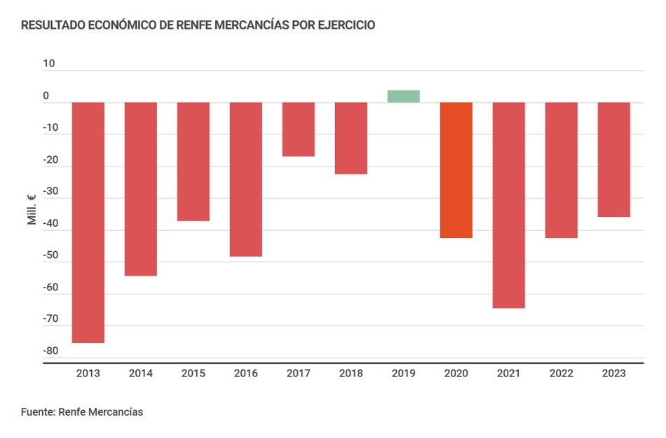 Este comportamiento en el movimiento de mercancías dejará también su impacto en la futura cuenta de resultados del ejercicio, que se sumará a las pérdidas acumuladas de los últimos años. Sólo en 2023 registró números rojos por valor de más de 36 millones de euros. En el periodo entre el 2019 y el 2023, es decir, en los últimos cinco años, Renfe Mercancías ha sufrido pérdidas por valores superiores a los 180 millones de euros. Si se acude a la última década, son más de 360 millones de euros acumulados.